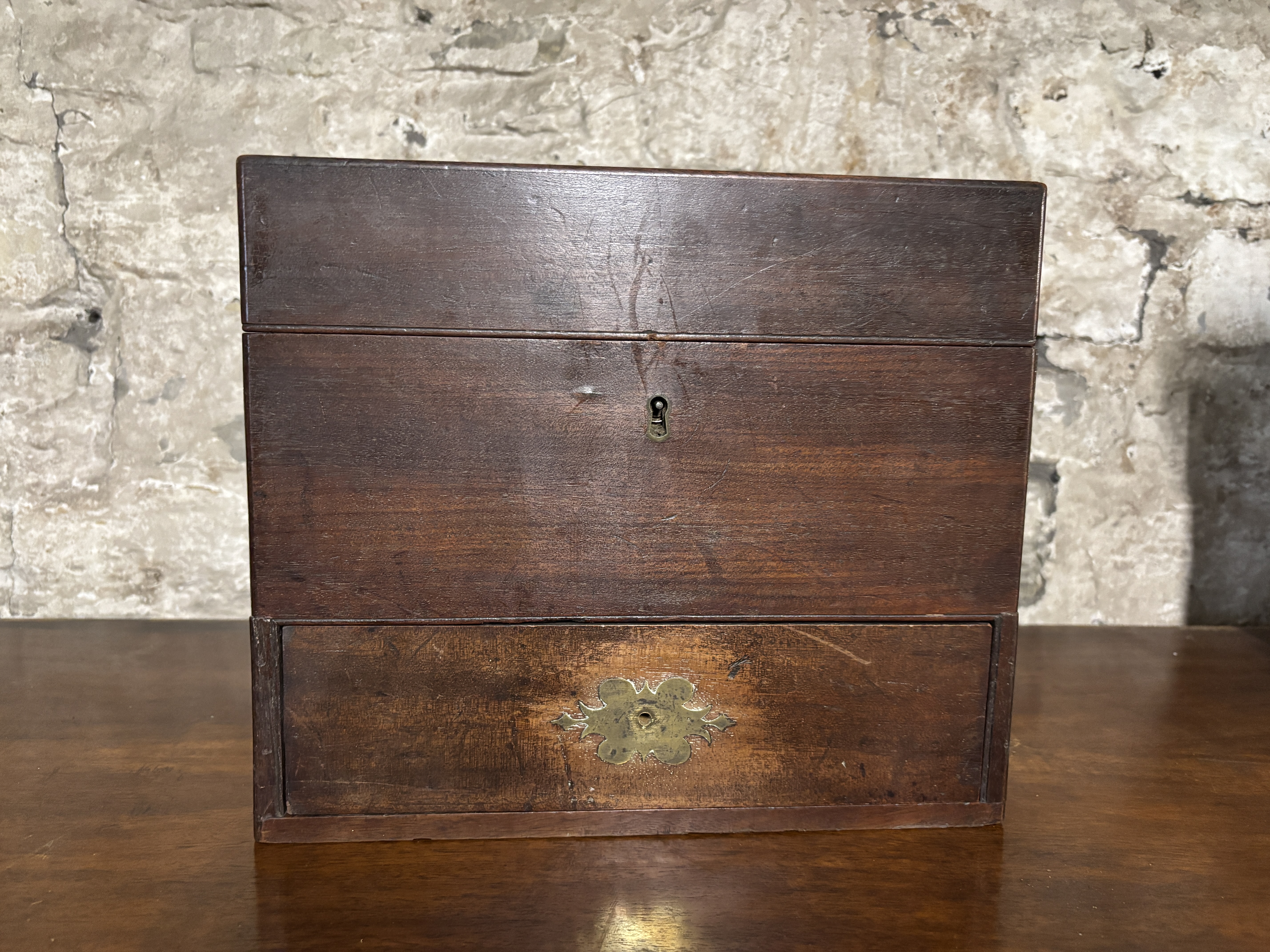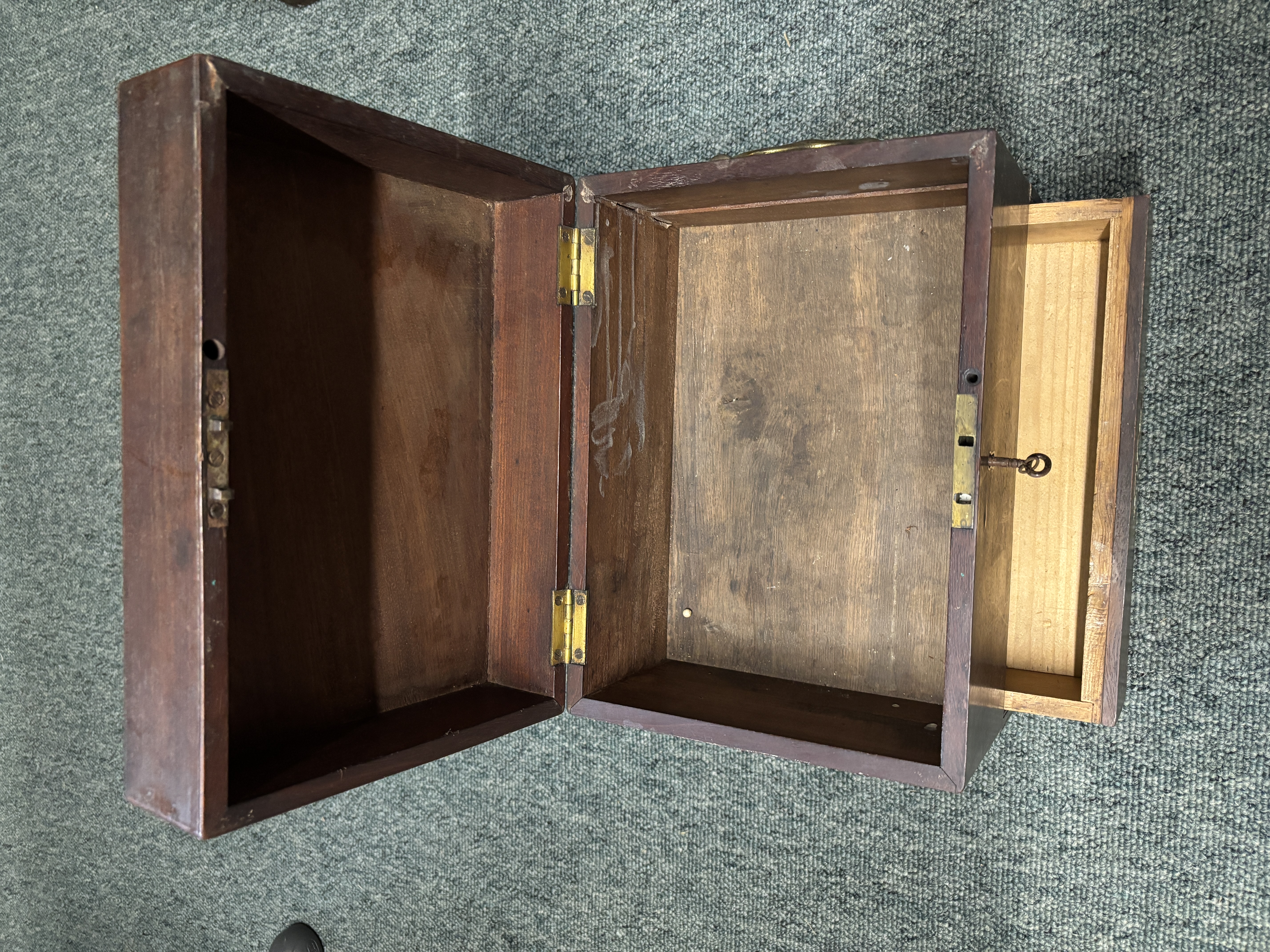 A wooden box with two carrying handles,   lift up lid and drawer under