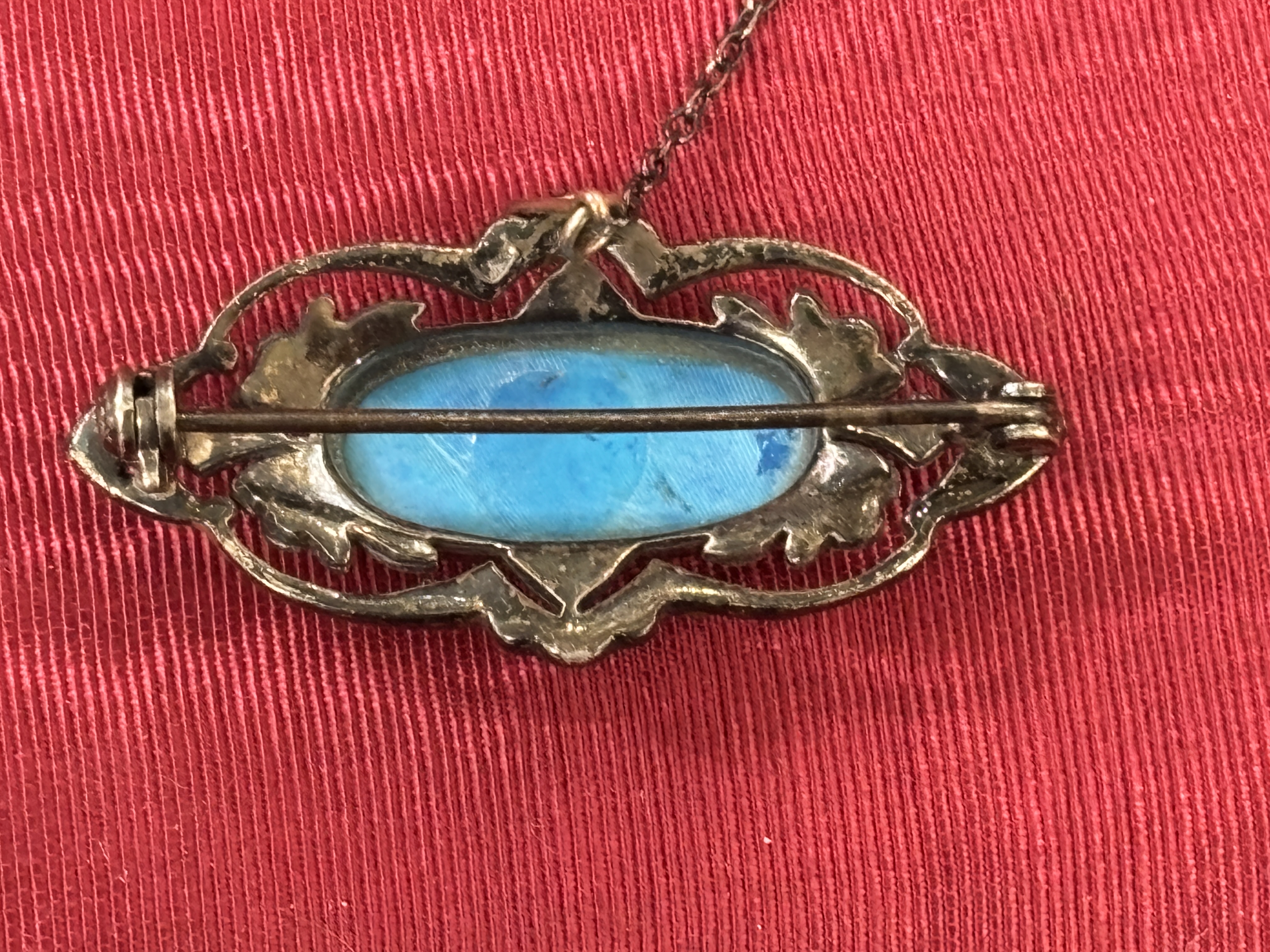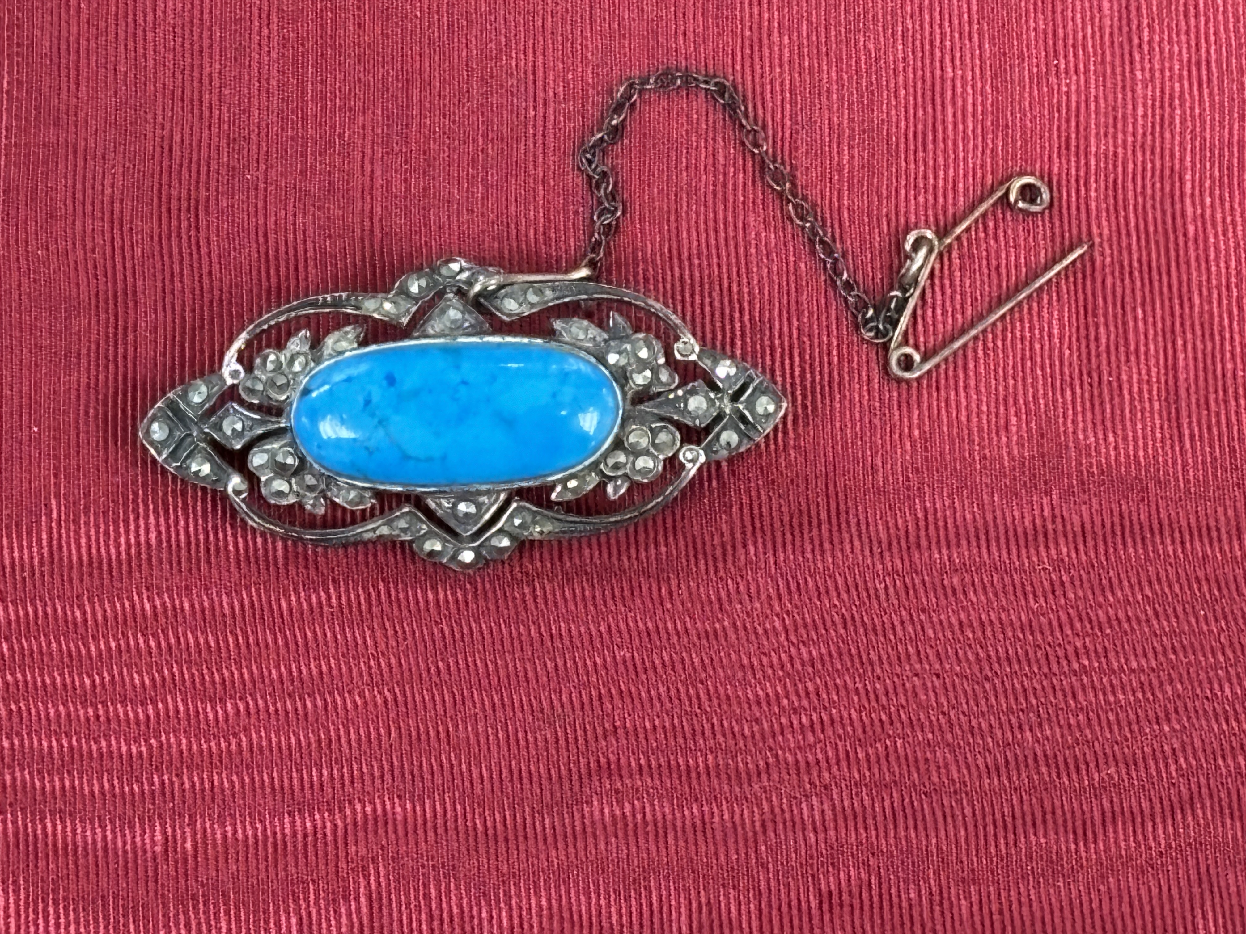 Vintage Silver-Coloured Openwork Navette Brooch with Turquoise-Coloured Cabochon and Marcasites