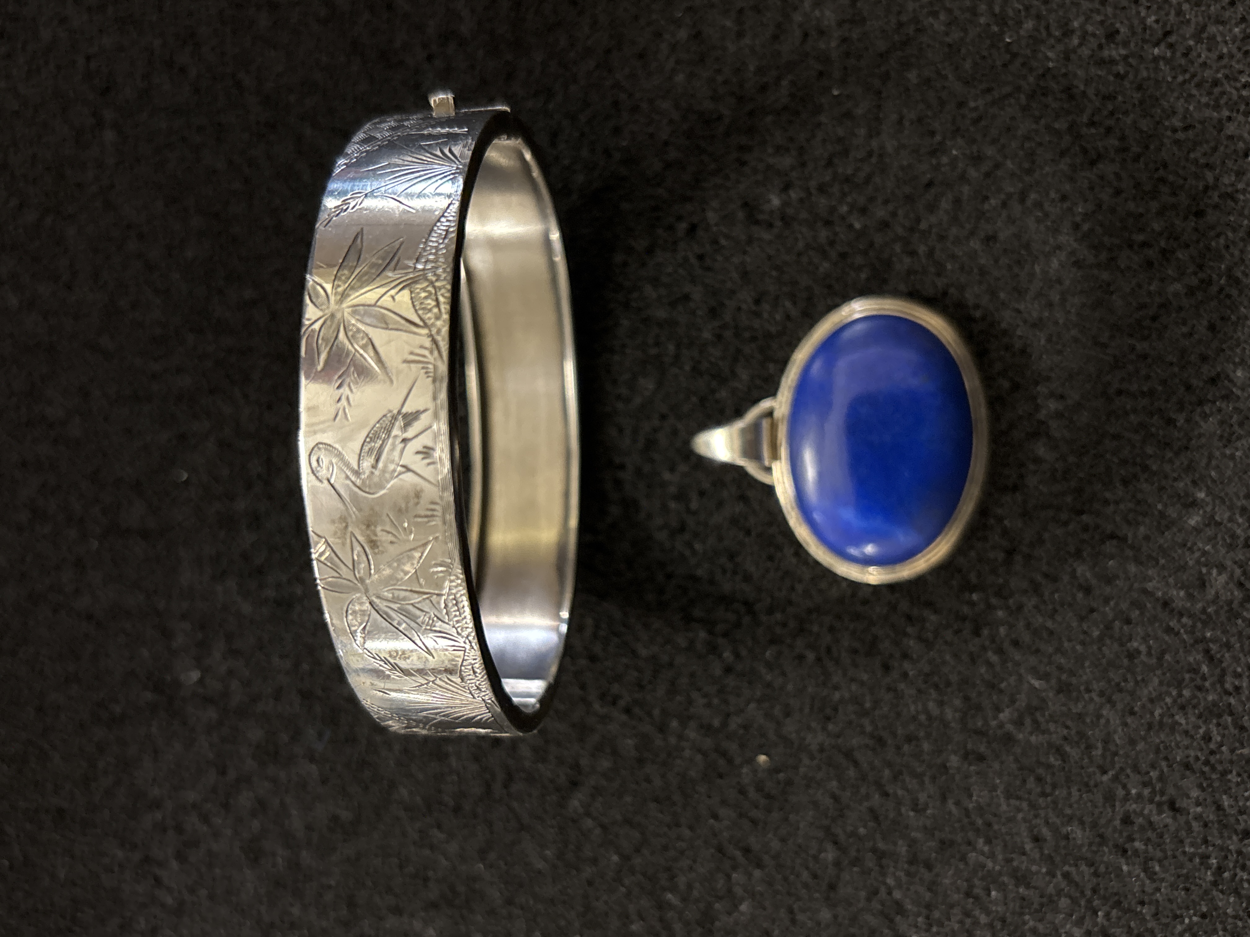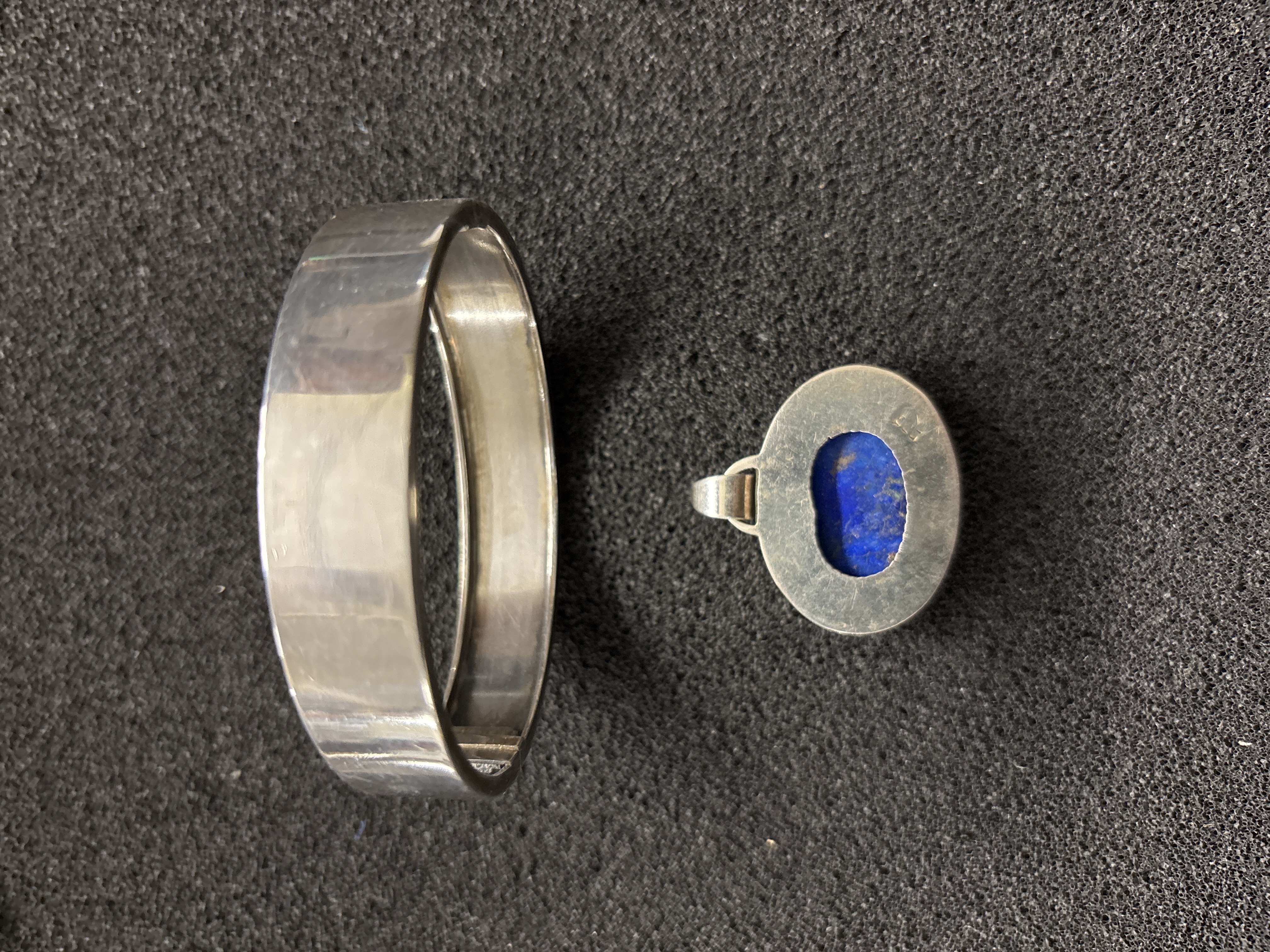 A Silver hinged bangle (tested) together with a Lapis Lazuli Pendant stamped 925