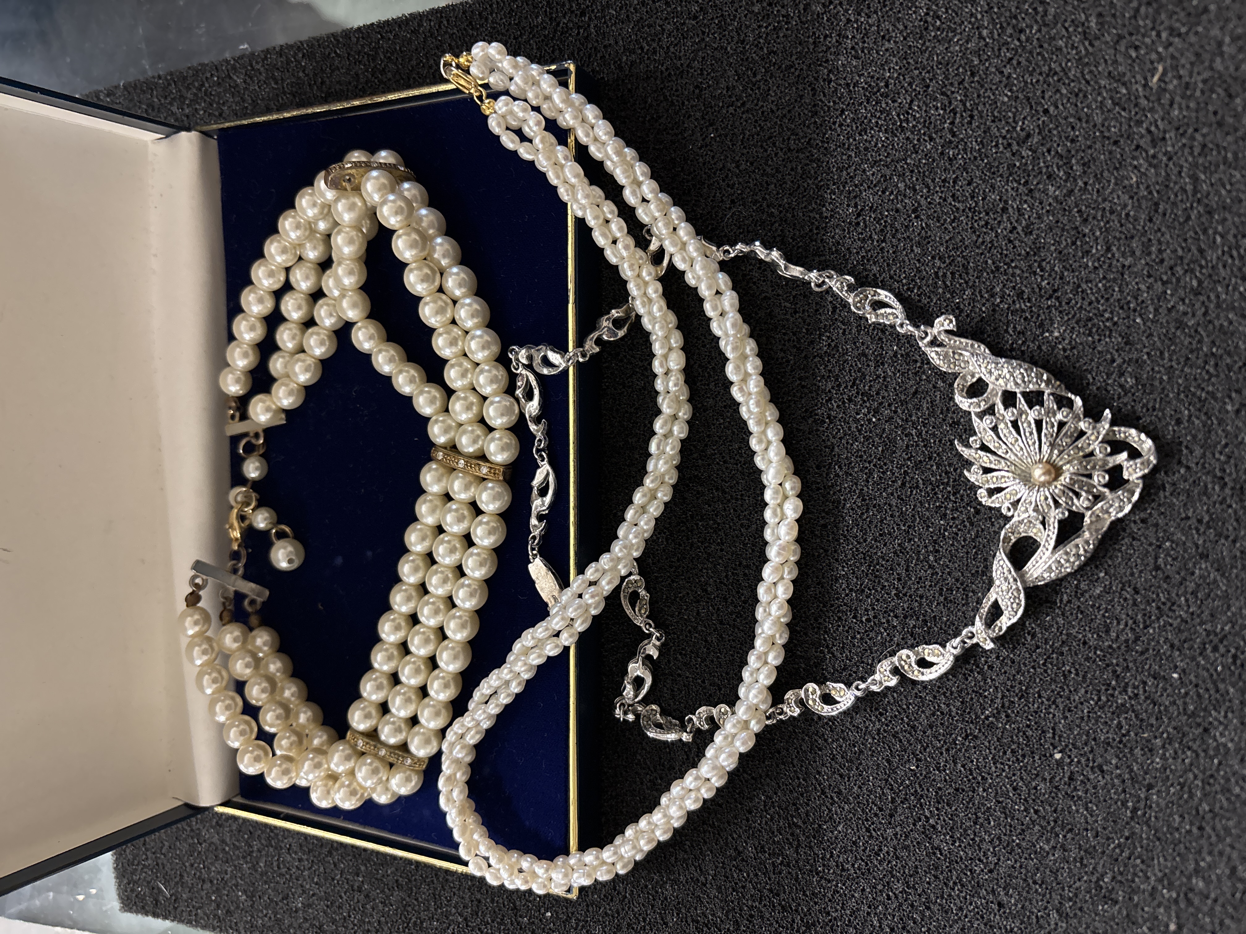 A pearl necklace, a triple stranded pearl choker and a vintage Marcasite necklace