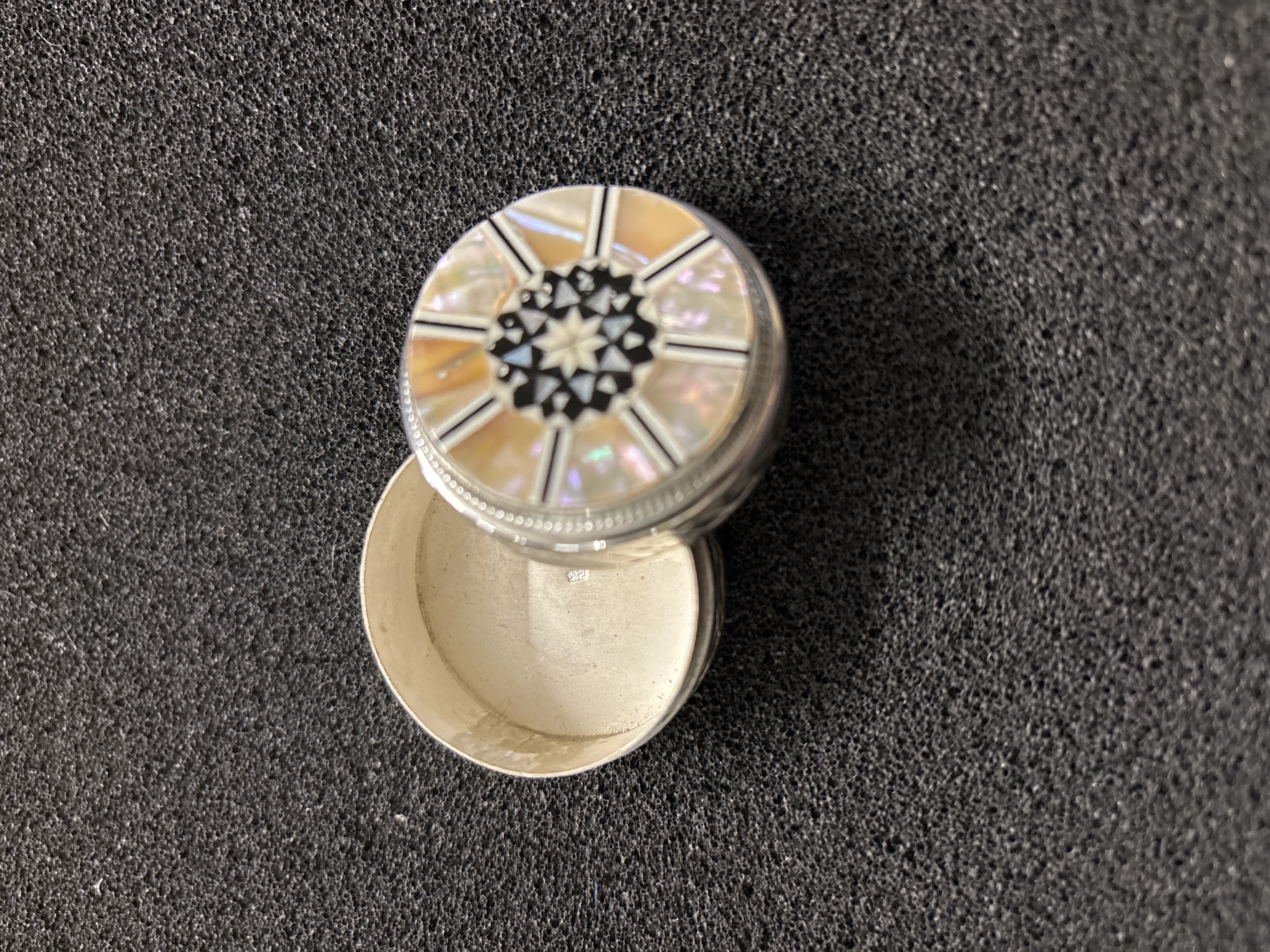 A small silver trinket / pill box with mother of pearl decoration to the top