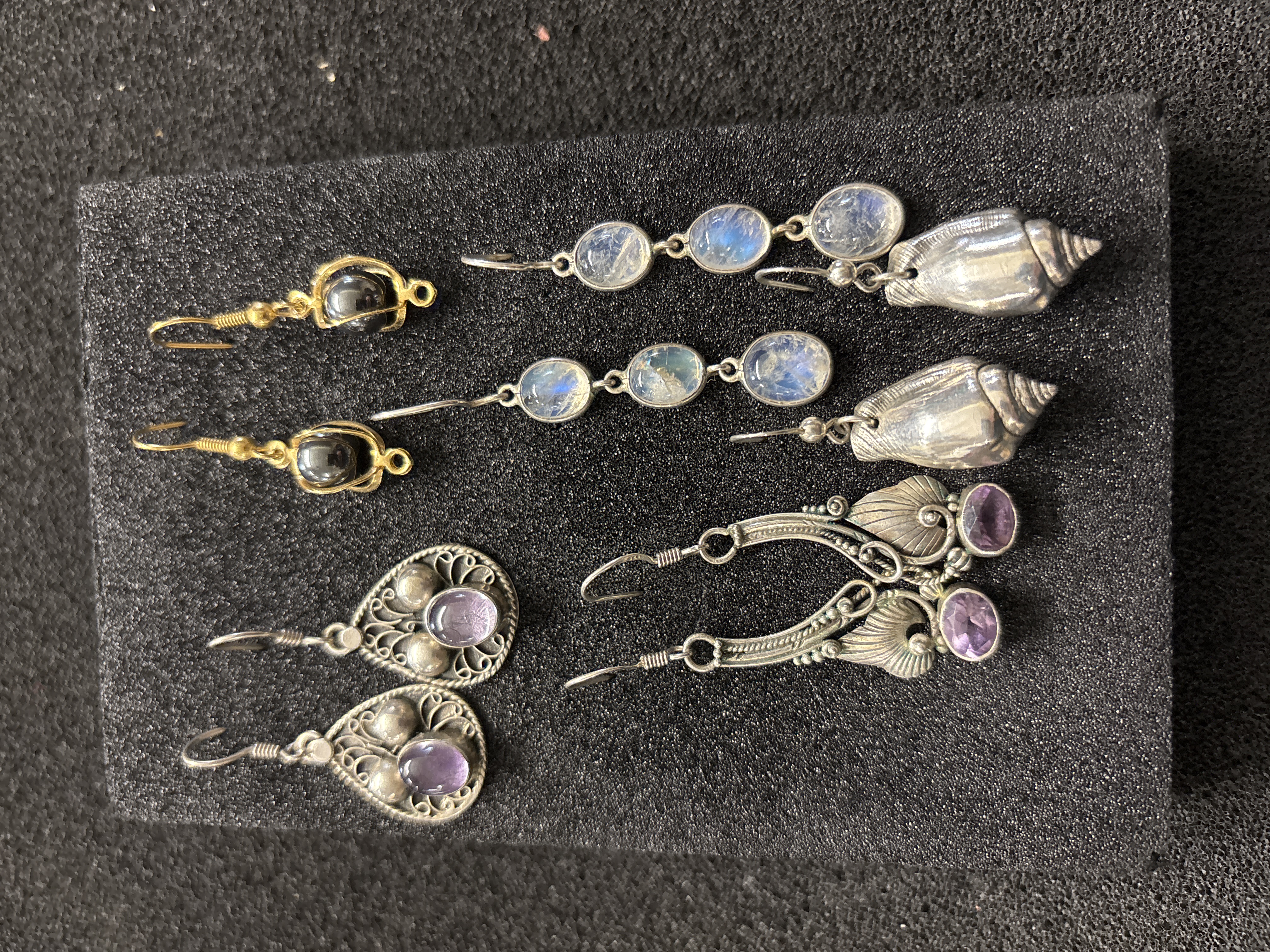 Five pairs of drop earrings some marked 925
