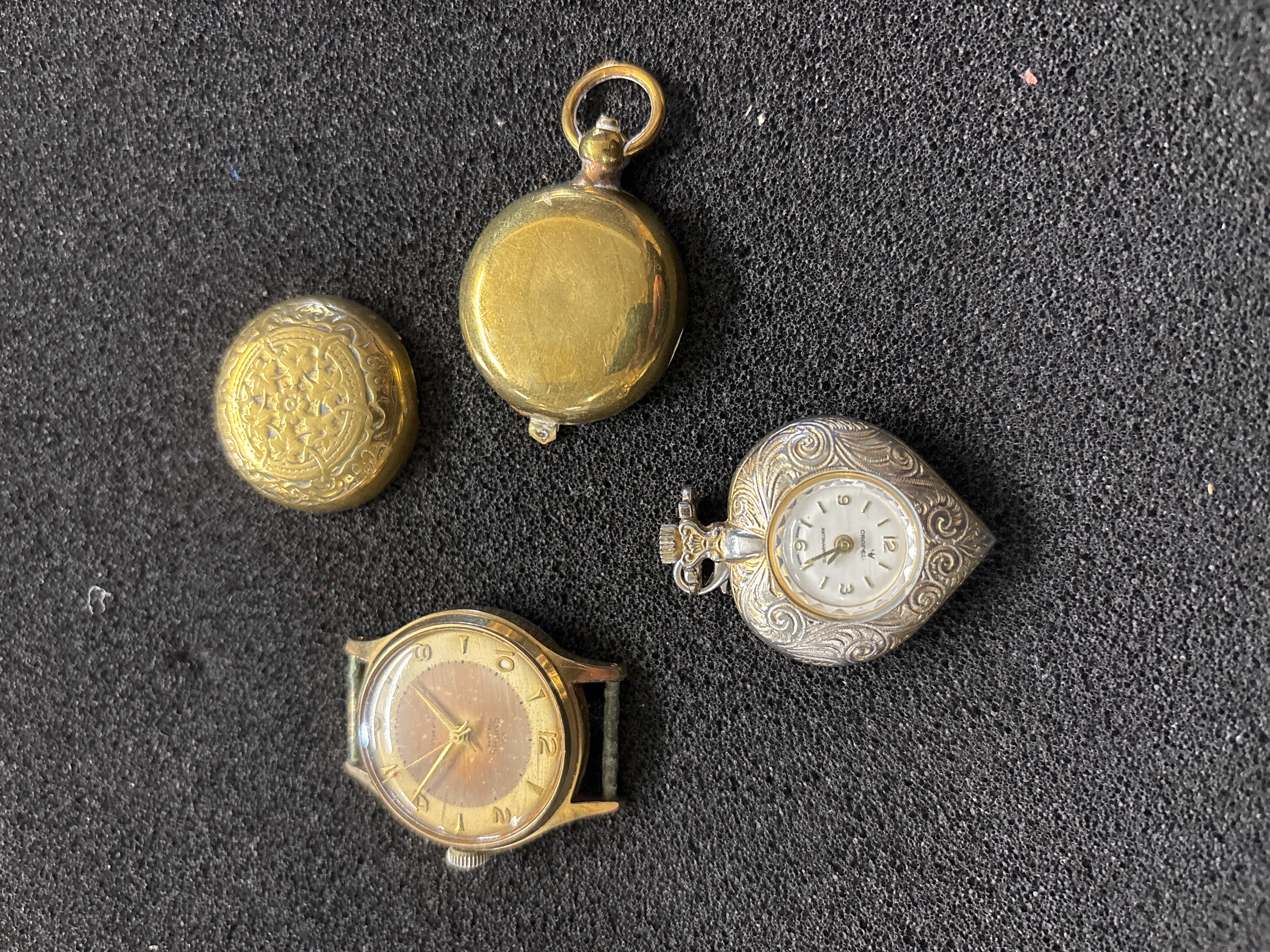 A vintage Gents Smiths watch together with a ladies heart shaped pendant watch and a sovereign case a/f