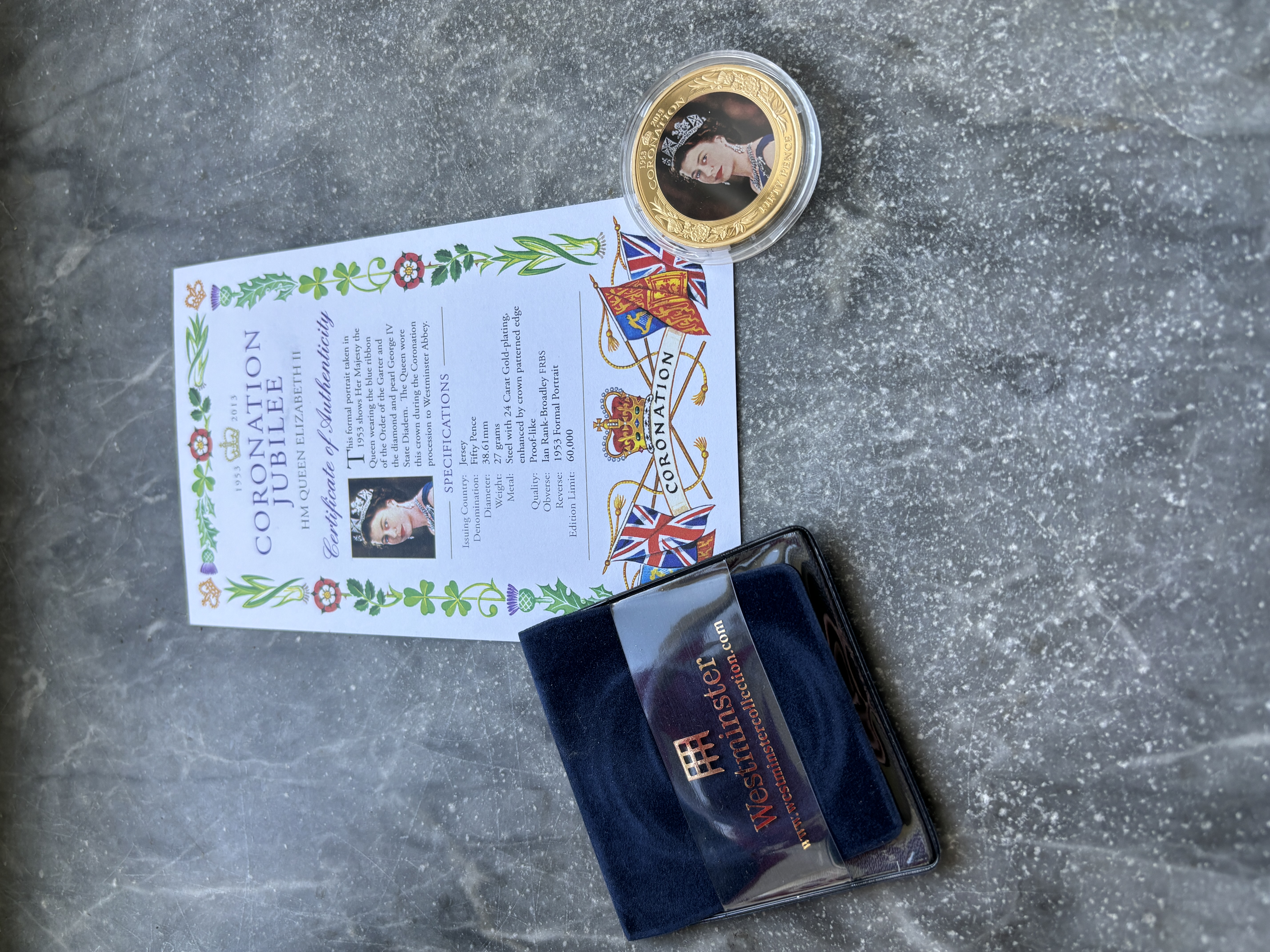 A 2013 Jersey commemorative fifty-pence coin issued by The Westminster Collection to mark the 60th anniversary of the Coronation of Queen Elizabeth II. The coin is composed of steel with 24-carat gold plating. The reverse features a central colour-printed 1953 formal portrait of Her Majesty, surrounded by a gold-coloured border inscribed 1953 CORONATION 2013 and FIFTY PENCE. According to the accompanying documentation, the obverse features the portrait of the Queen by Ian Rank-Broadley FRBS. The coin is finished with a crown-patterned edge. The item is housed in a clear protective capsule and includes the original Certificate of Authenticity and a blue velvet-covered display case.