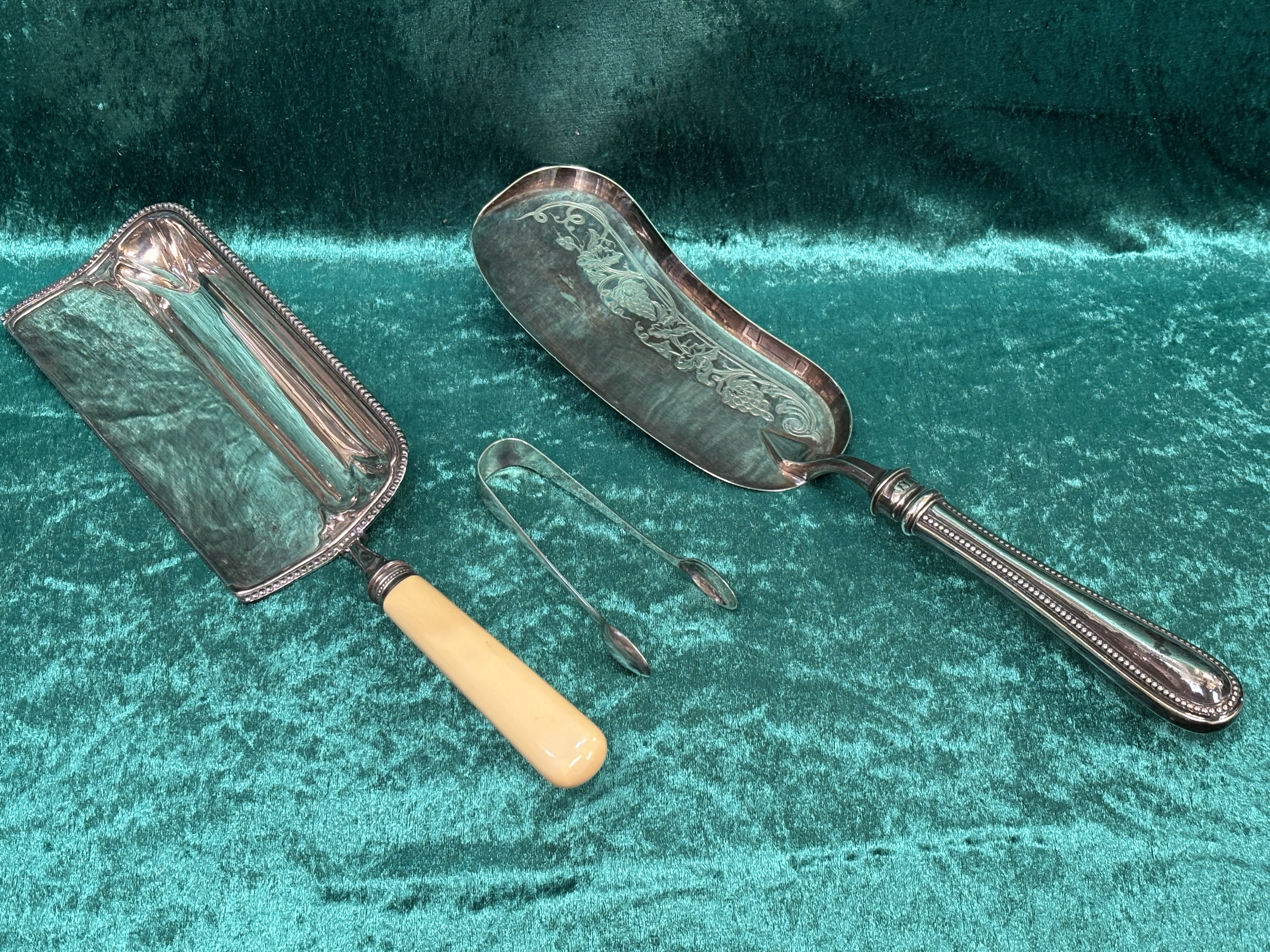 A Trio of Silver-Plated Table Service Items Including Two Crumb Scoops and Sugar Tongs