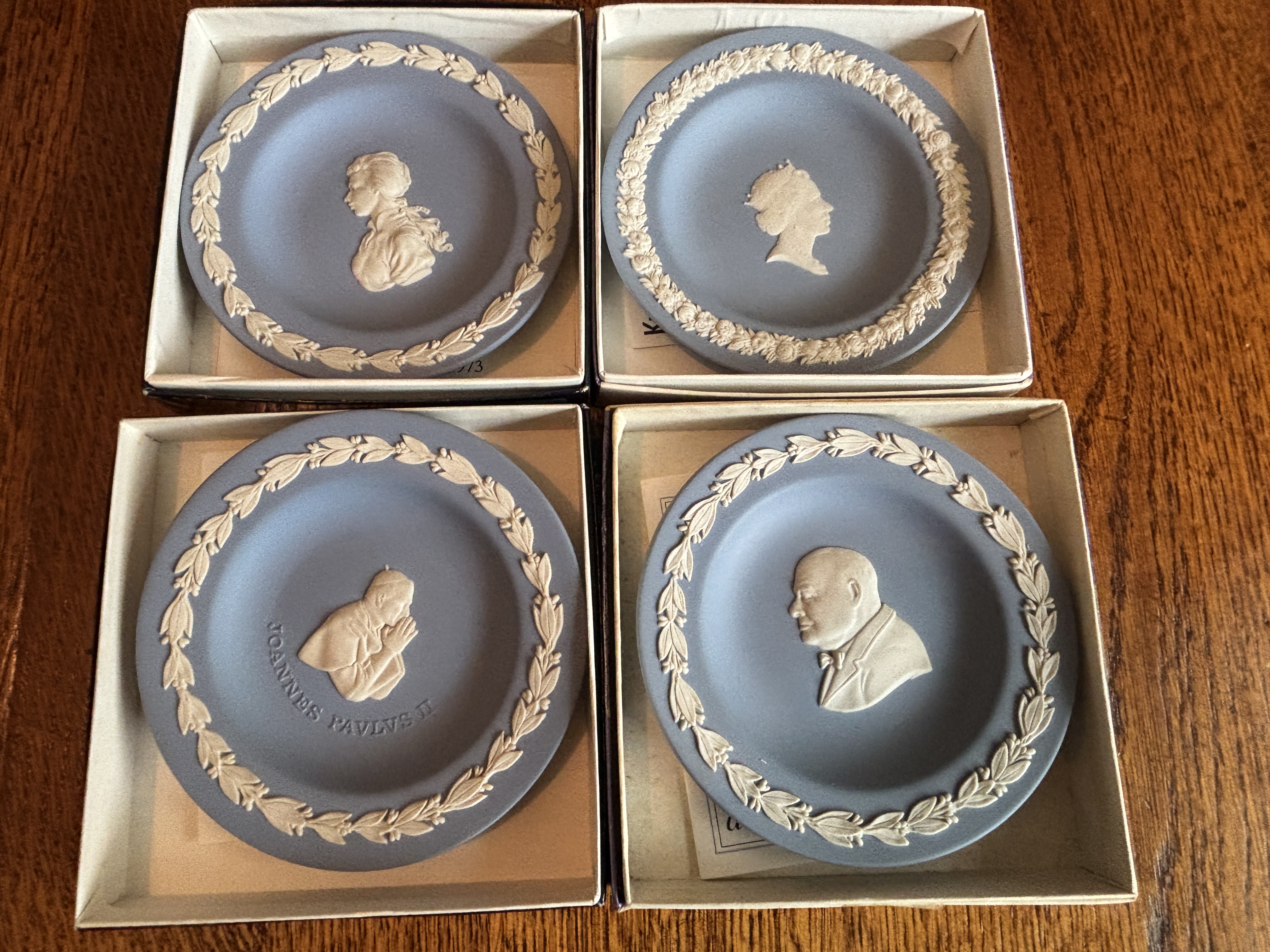 Four boxed Wedgwood plates, HM Queen Elizabeth, Princess Anne, Pope John Paul and Winston Churchill