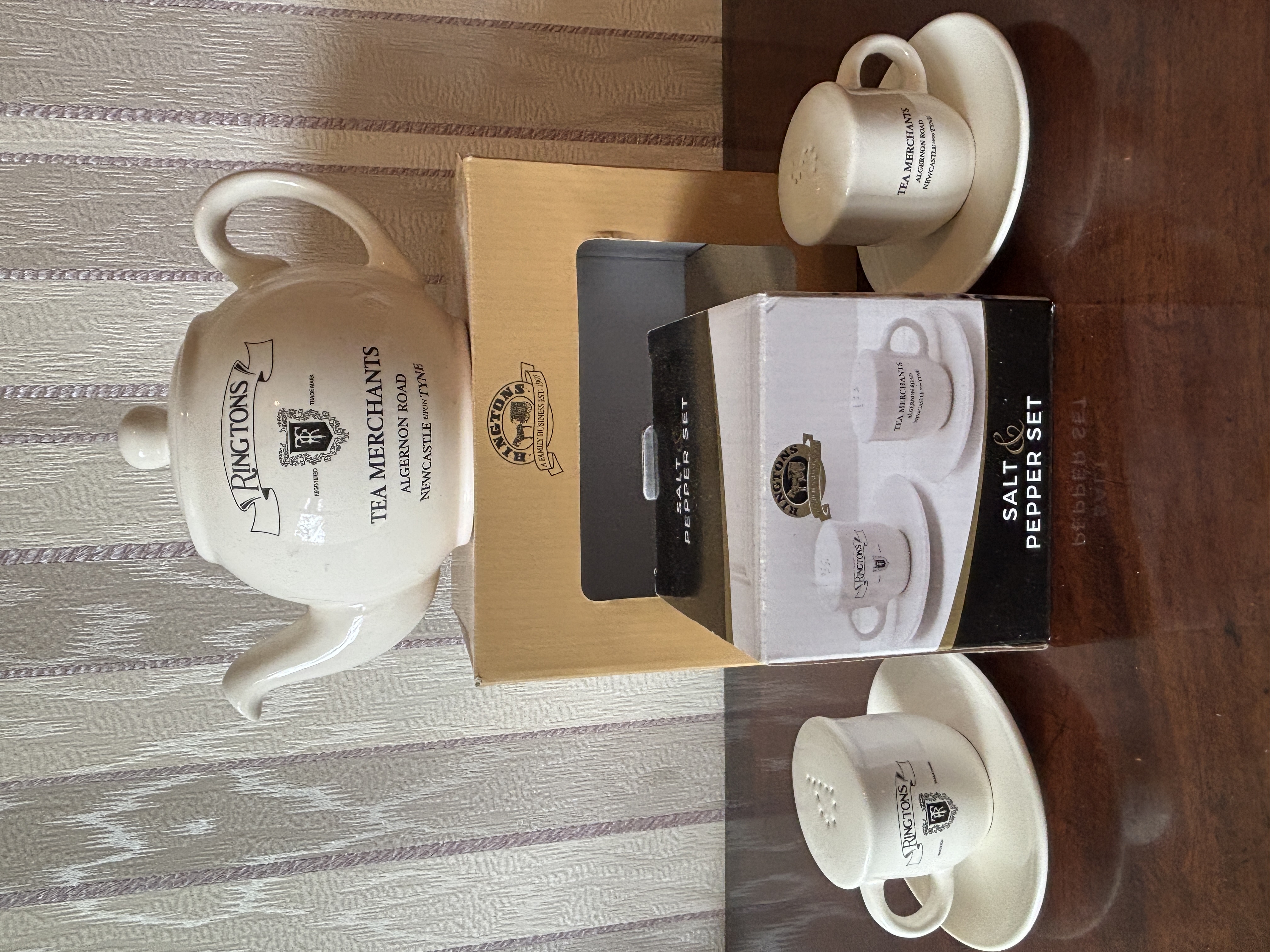 A Rington’s Tea, Tea pot together with a cruet set in the shape of a cup and saucer