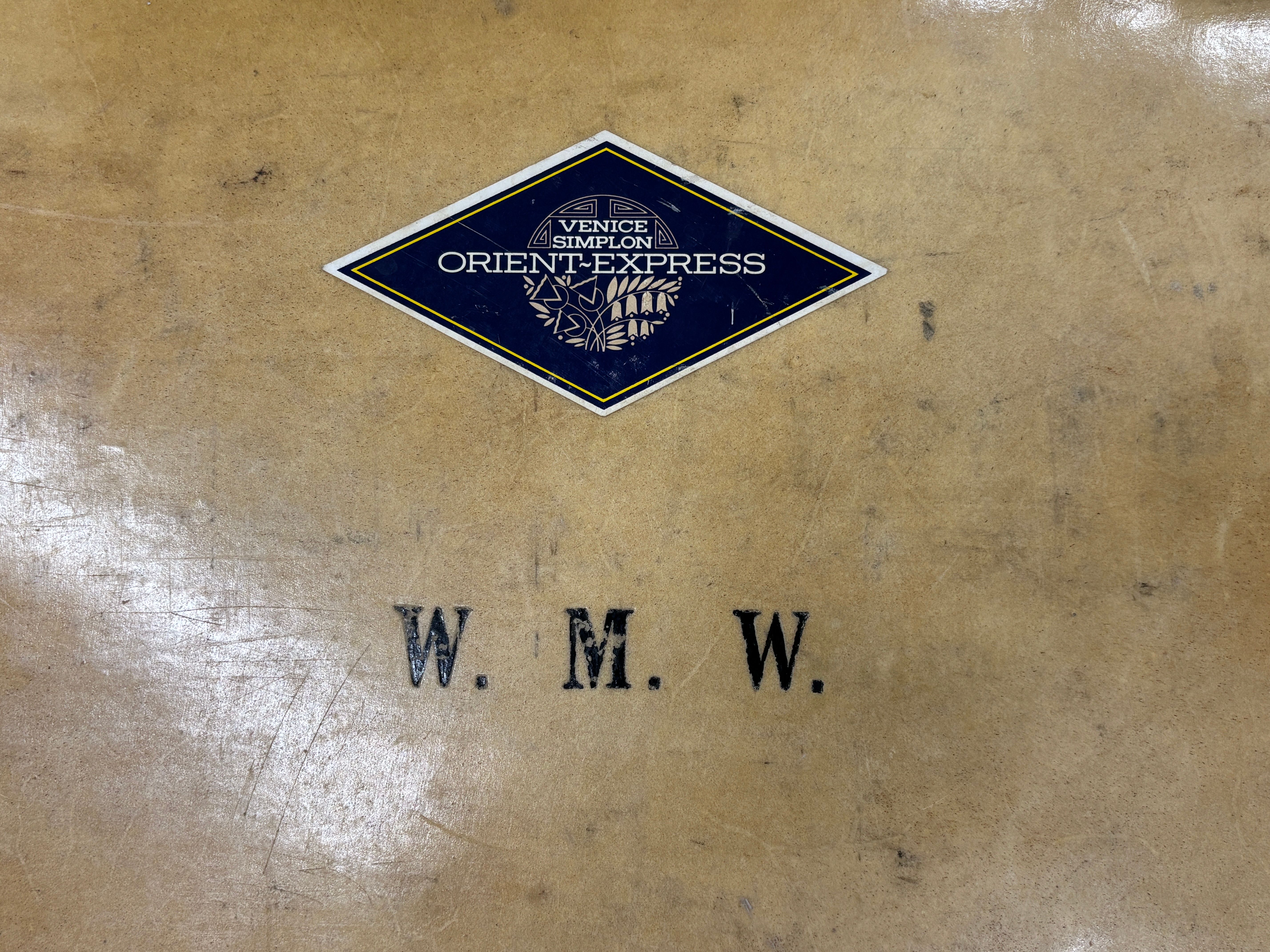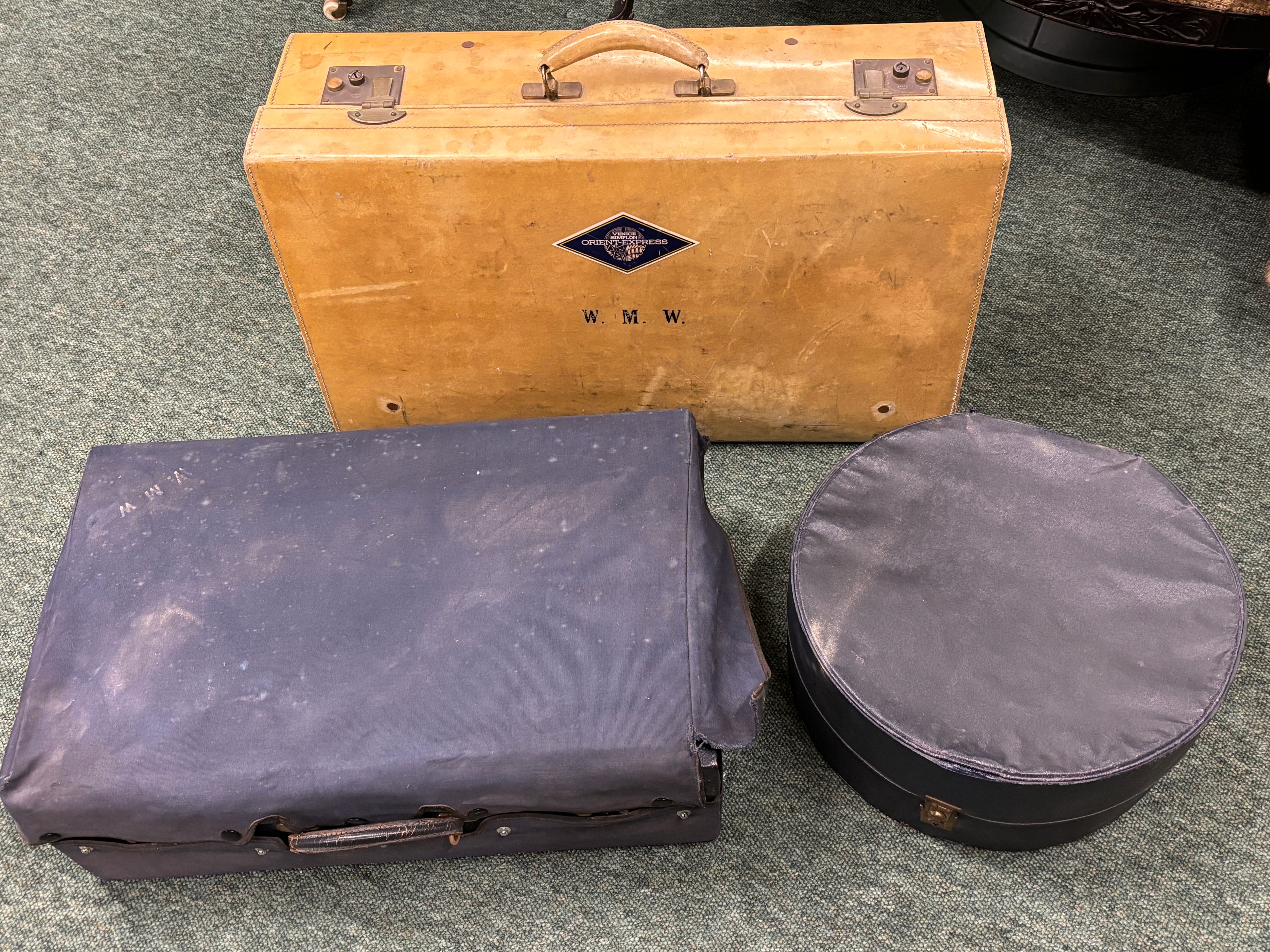 A cream Vellum suitcase with initials WMW and a Venice Simplon Orient Express label, together with a Blue suitcase with protective cover and matching hat box (three pieces)